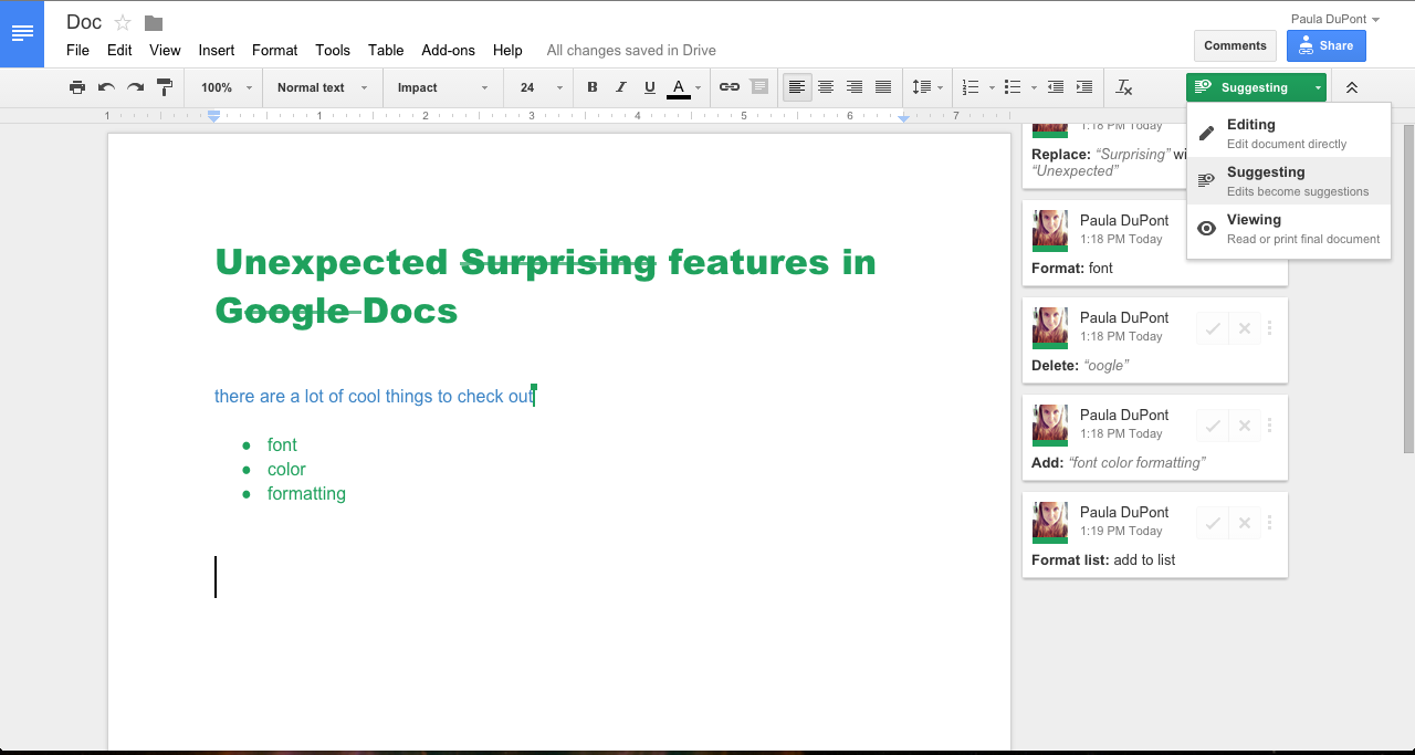 They read your writing and point out (add comments) what you should change. Track changes is an essential review feature in text editor apps. Click it, and choose suggesting. Now, when they want to review the changes, they don't have to sift through the entire text, just the marked changes that you've made. On your computer, open a document at docs.google.com.